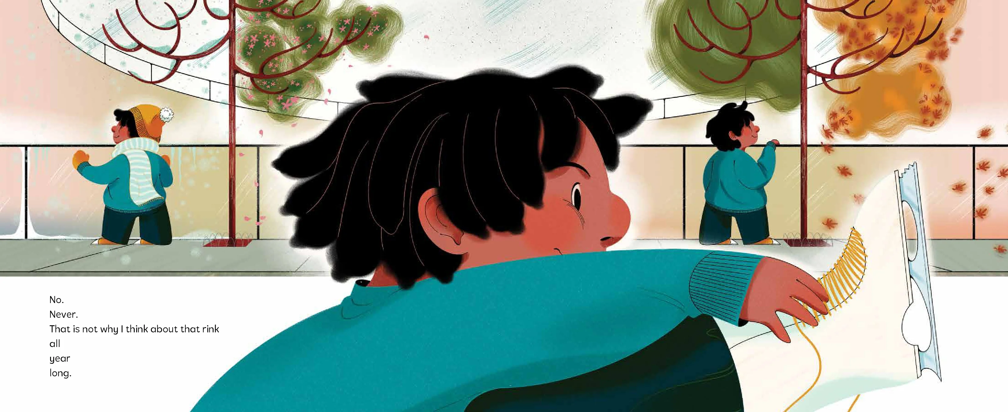 A young Black child passes an ice rink every day walking home with Momma. Last year, the rink was tricky. It looked clear and smooth, but felt rough and rude after a fall. Brrr! Ouch! Even so, the child hasn’t been able to stop thinking about that rink. The young skater is determined to do something for the first time: a spin on the ice. Because, as Momma says, nothing is impossible.